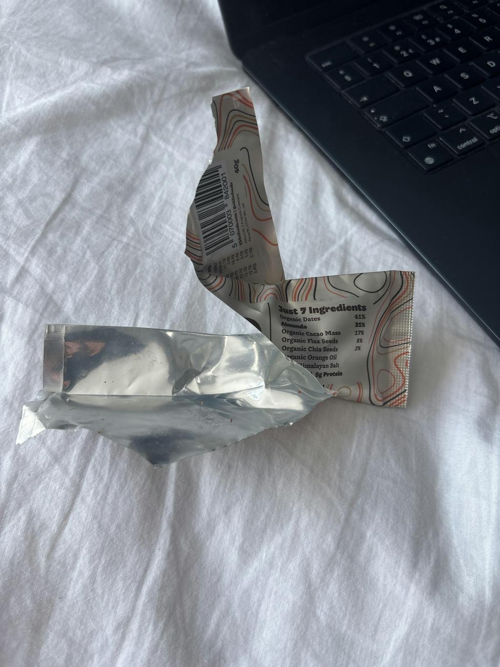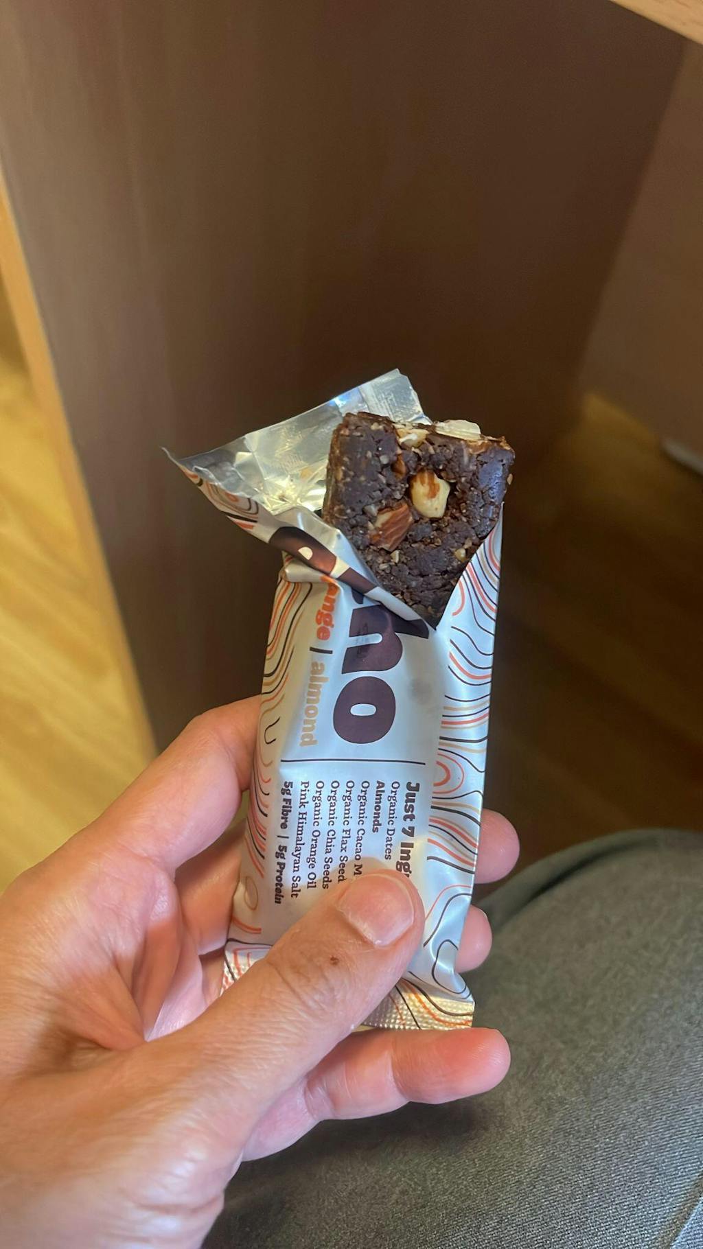 Personally, I think the macros are pretty solid. It’s not your typical “protein bar” (5g protein for ~200 cals), but the ingredients are so clean: just 7 simple things — dates, almonds, cacao mass, flax seeds, chia seeds, orange oil & Himalayan salt. No additives, no weird fillers. Plus, 5g fiber is great, and even though there’s 9.4g sugar and 3g saturates, it’s all coming from natural nuts, seeds, and dates.